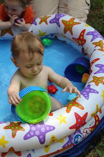Aiden's standing very routinely now. Comfortable for up to two minutes at a time. He took a few steps this weekend to bridge the gap between the couch and this play table.